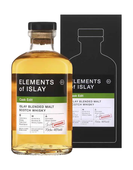 Elements of Islay Cask Edit fait partie de la nouvelle trilogie Elements of Islay signée Oliver Chilton, maître assembleur de chez Elixir Distillers. Les single malts riches et fumés de la côte sud d'Islay se marient avec un style plus frais et fruité provenant du nord. L'expression Cask Edit est un assemblage de trois types de fûts : le refill, le bourbon et le sherry s’associent pour offrir une dégustation à la fois fraîche et épicée, au caractère bien fumé.
